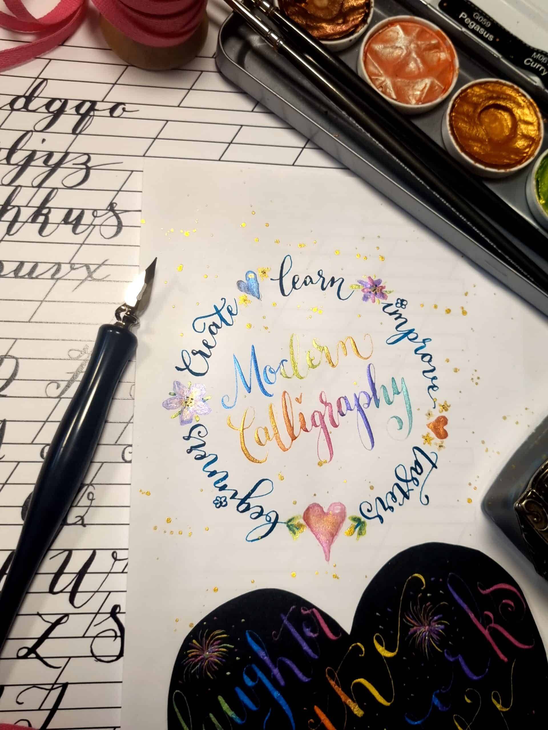 On this course you will get hands on with the new fun, quicker way to learn calligraphy using fine point nib. In the morning, we will get used to the script and practice, and in the afternoon, I will show you design layout and all you will need to be happily confident that you can use this new-found skill regularly after leaving the class on all those special things you are creating. This is what you can expect from our modern calligraphy tutorial. I will also show you the difference different inks, nibs and papers make to your work and introduce you to ‘Coliro’ which is a fabulous new metallic product that makes your work look a million dollars!