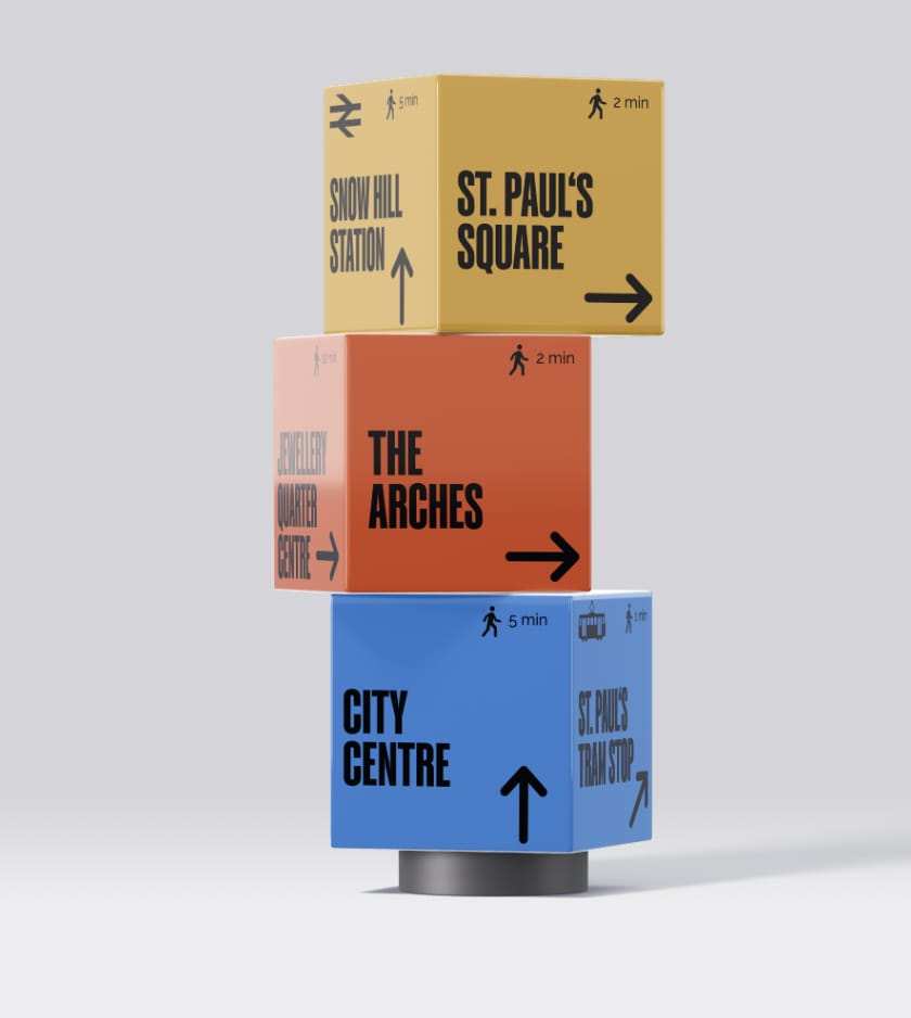 A wayfinding project for the Jewellery Quarter, designed to make the area easier to navigate through striking cube signage, mapped routes, and a clearer shared identity.
